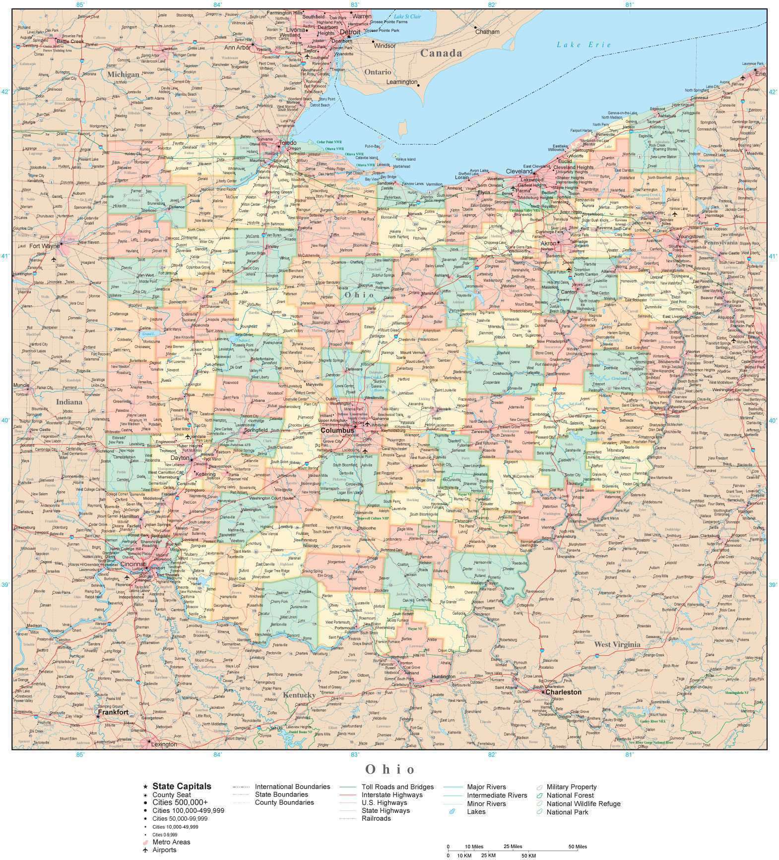 Ohio Adobe Illustrator Map with Counties, Cities, County Seats